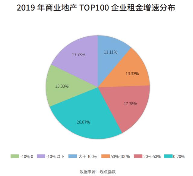 需要關(guān)注到租金收入增速呈現(xiàn)負(fù)數(shù)的企業(yè)也不在少數(shù),占商業(yè)地產(chǎn)TOP100榜單的31.11%。