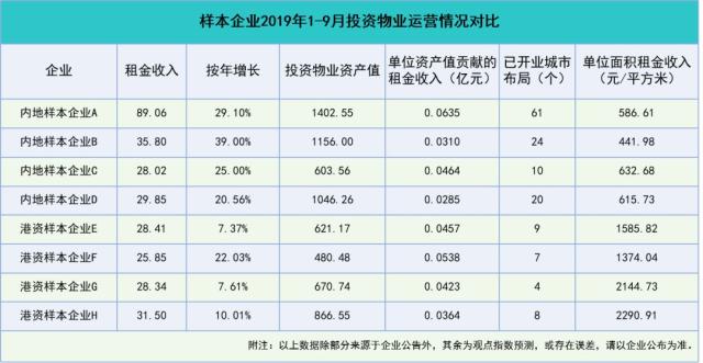 以?xún)?nèi)地樣本企業(yè)A到D來(lái)看,其2019年1-9月的租金收入在所有8個(gè)企業(yè)中表現(xiàn)較為優(yōu)異,基本處于28億元人民幣以上。而從增速來(lái)看,內(nèi)地的同比增速均為雙位數(shù),處于20%-39%之間,最高的為樣本企業(yè)B,2019年1-9月的租金收入預(yù)計(jì)為35.8億元,同比增長(zhǎng)39%。