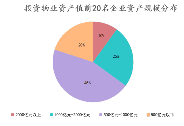 從投資物業(yè)資產(chǎn)值前20名企業(yè)來(lái)看,有16家企業(yè)的資產(chǎn)規(guī)模均超過(guò)500億元,其中500億元-1000億元的企業(yè)有9家,占比45%;1000億元以上的企業(yè)有7家,占20名企業(yè)的35%。